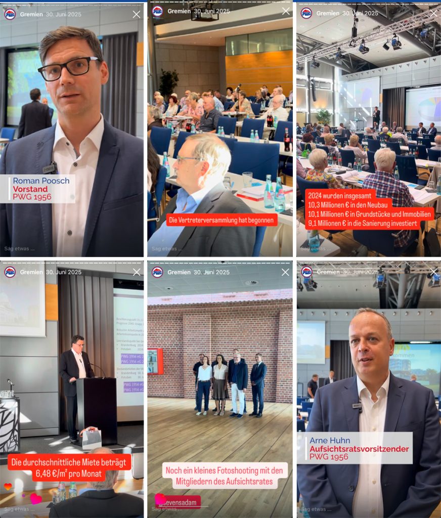 Als Pilotprojekt kam das neue Format schließlich bei der Vertreterversammlung der PWG 1956 am 24. Juni 2024 erstmals zum Einsatz und veränderte den Blick auf diese Veranstaltung grundlegend. Am Ende des Tages standen 52 veröffentlichte Stories und mehrere tausend Aufrufe. Mit diesem Erfolg war klar: Das Format hat Zukunft. Und es ermöglicht vielen Mitgliedern den Zugang zu einer Veranstaltung, die bisher nur einem kleinen Kreis vorbehalten war.