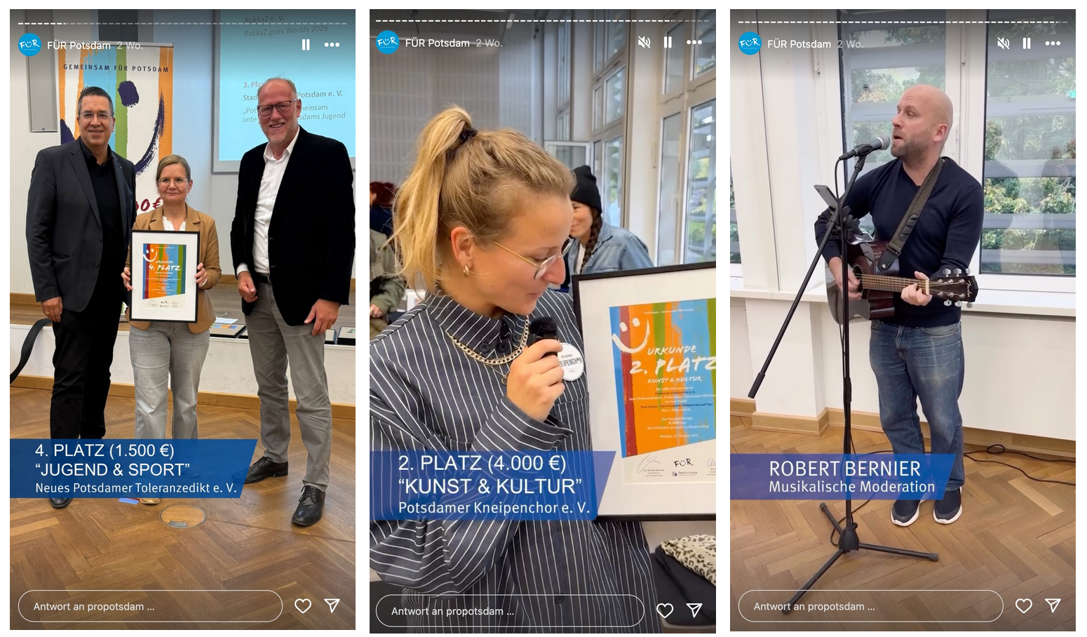 Mittlerweile setzen wir das Format auch bei anderen Veranstaltungen ein. So begleiteten wir unter anderem die Abschlussveranstaltung des Wettbewerbs „ProPotsdam – Gemeinsam FÜR Potsdam“ live auf Instagram. Auch hier stellte sich der gewünschte Effekt ein: Die Mischung aus klarer Struktur, guter Vorbereitung und der Dynamik eines Live-Formats, etwa von spontanen Einspielern, überzeugt und erreicht viele Menschen. Durch die Vernetzung mit teilnehmenden Initiativen konnte bei dieser Veranstaltungsreihe die Reichweite zusätzlich gesteigert werden.