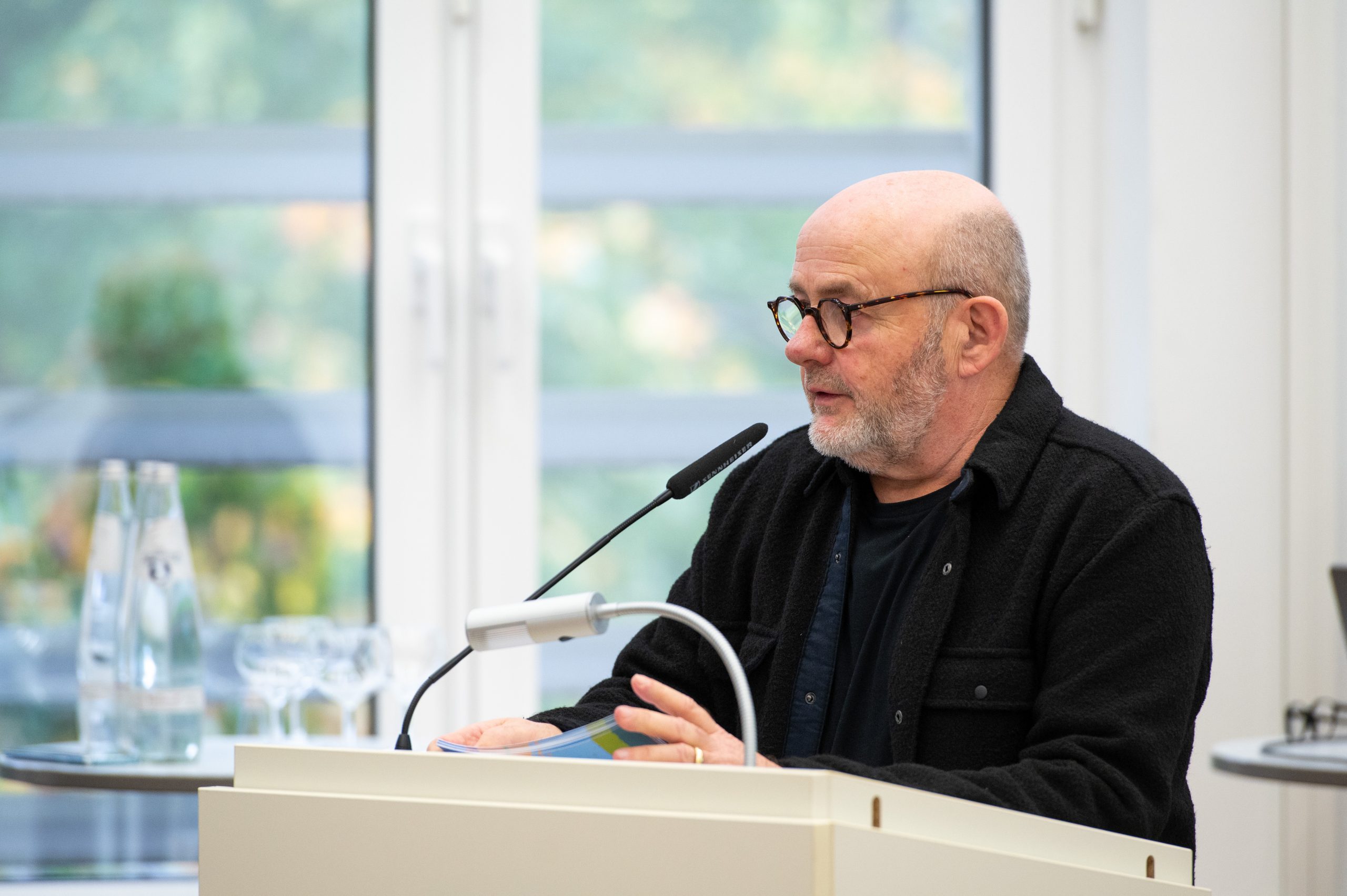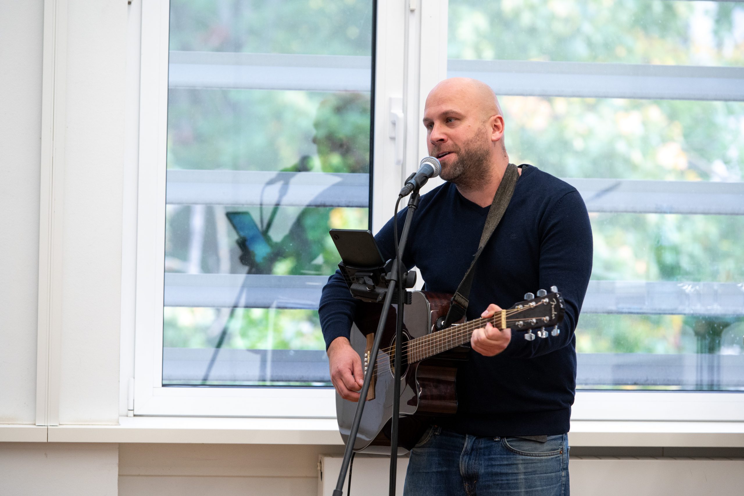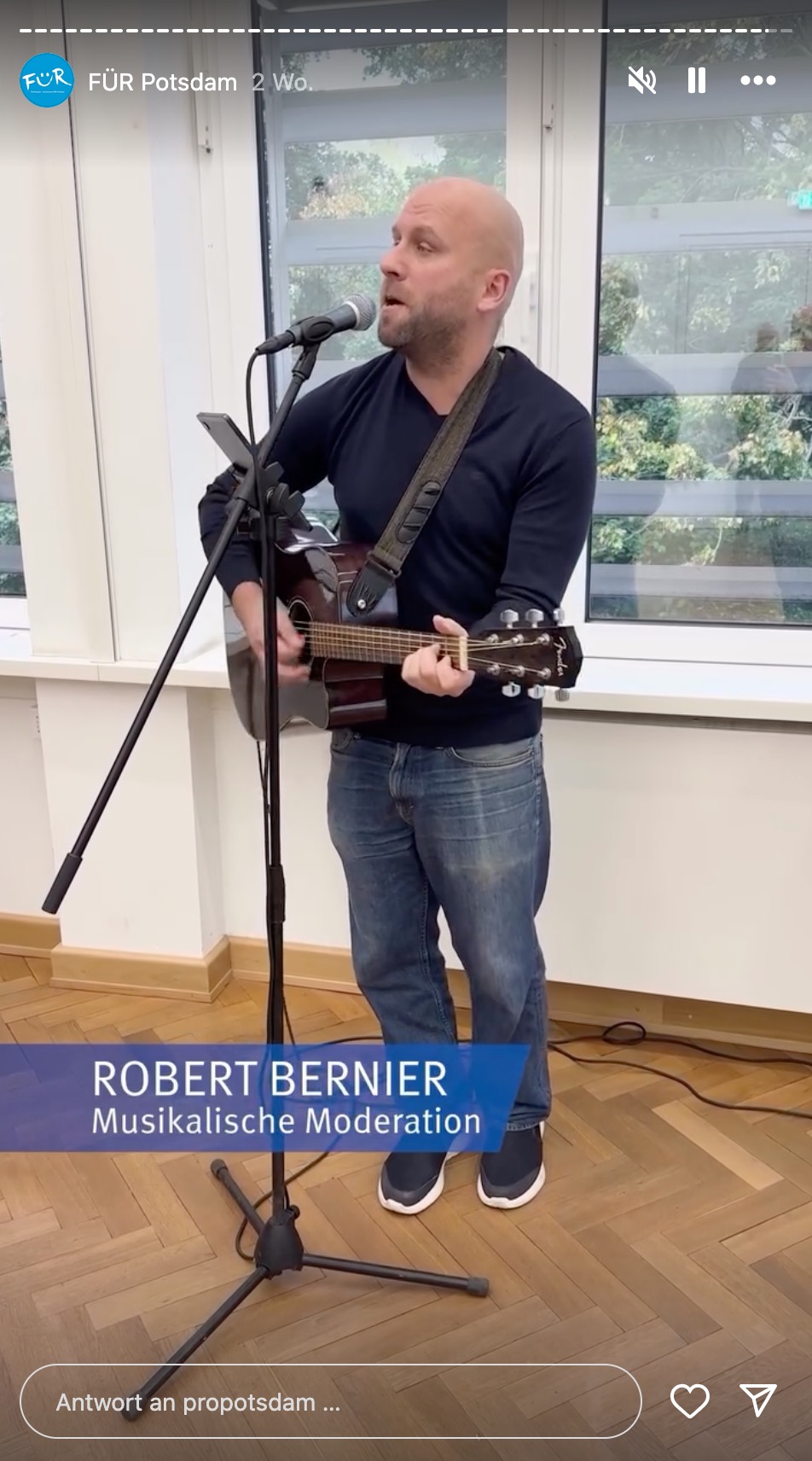 Die zweite Neuerung war die Moderation durch ein Double: Unser Chef Carsten Hagenau führte gemeinsam mit dem Potsdamer Musiker Robert Bernier durchs Programm, wobei Robert mit Gesang und Gitarre für Rhythmus, offene Gesichter und kollektiven Gesang sorgte. Ein herzliches Dankeschön an Robert. Es war uns ein Vergnügen! Das gesprochene und das gesungene Wort gingen an diesem Nachmittag eine Verbindung ein, die elegant durch das Programm trug. Am Ende tauchte die AfD noch einmal auf. Ohne, dass es Worte gebraucht hätte, erkannte man sie und den reaktionären Zeitgeist, den sie verkörpert, hinter dem Liedtext, den Robert anstimmte: Das ist alles von der Kunstfreiheit gedeckt. Mit dem Song von Danger Dan demonstrierte Robert, wie man gut gelaunt politische Botschaften platzieren kann, ohne dabei allzu plakativ zu sein.