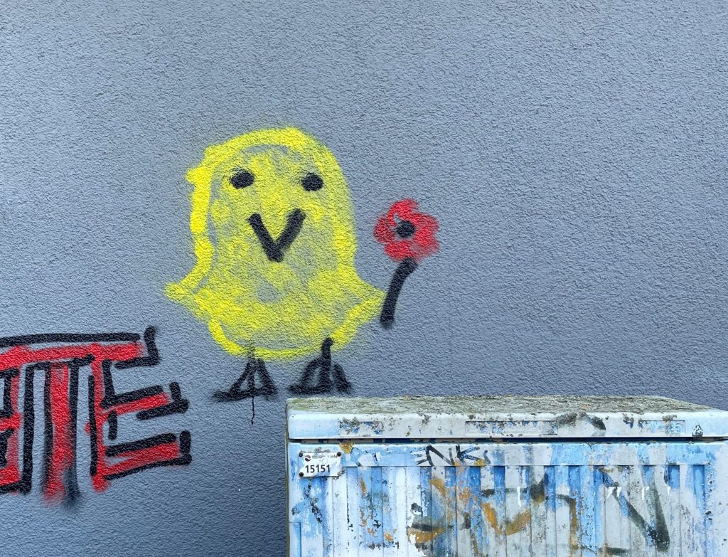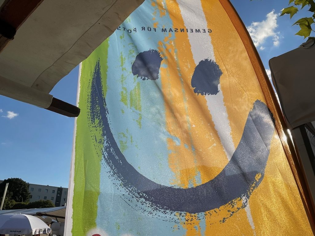 Die Kiste mit den Jutebeuteln ist leer. Auf dem Tisch liegen nur noch ein paar Buntstifte, Ausmalbögen und Flyer. Ich schaue nochmal rüber zur Fahne mit dem großen Smiley. Die letzten Sonnenstrahlen scheinen durch das feinporige Mesh-Gewebe der Beachflag, die sich langsam im warmen Wind bewegt.