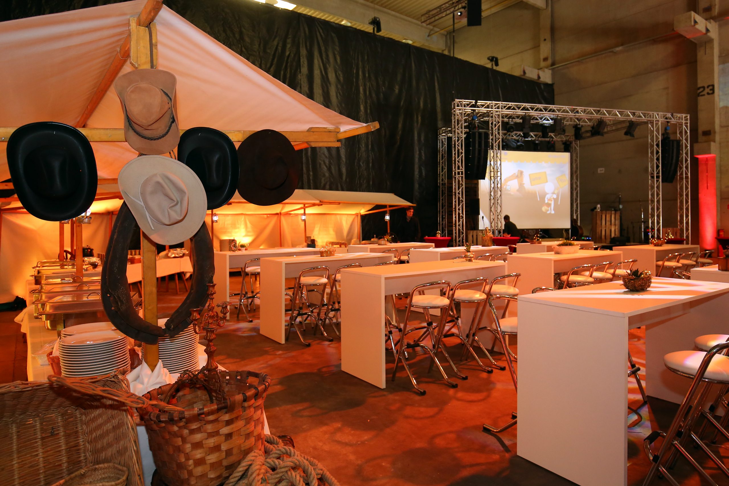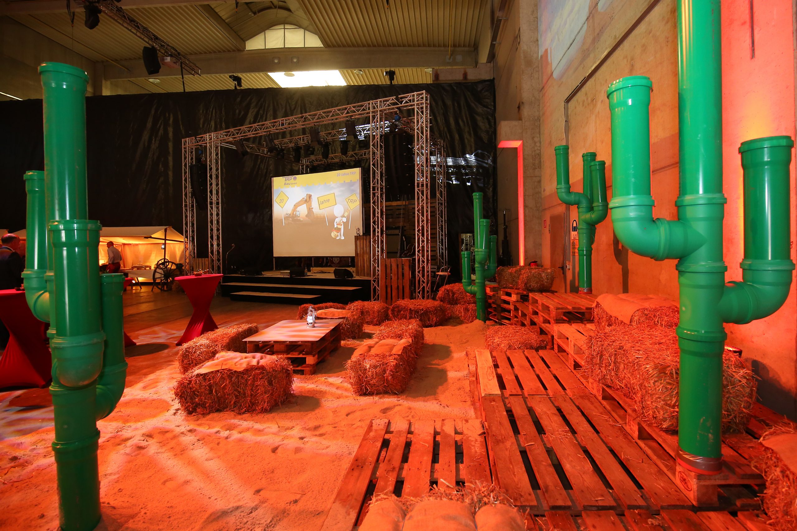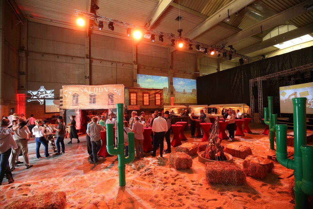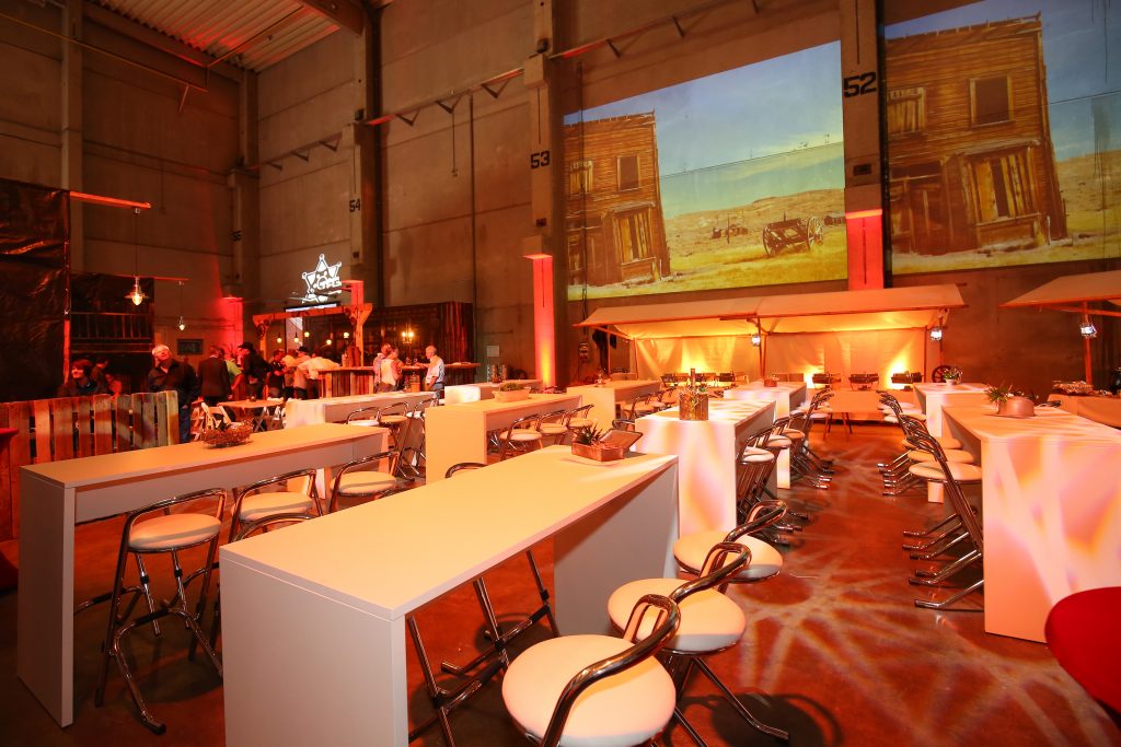 Ort des Geschehens war eine extra für diese Feier leer geräumte Lagerhalle, die wir zu einem Saloon inmitten einer gleichermaßen staubigen wie heißen Wüstenlandschaft verwandelten. Von den Einladungskarten über Programm und Catering bis hin zur Deko atmete das Fest den Geist des Wilden Westens.